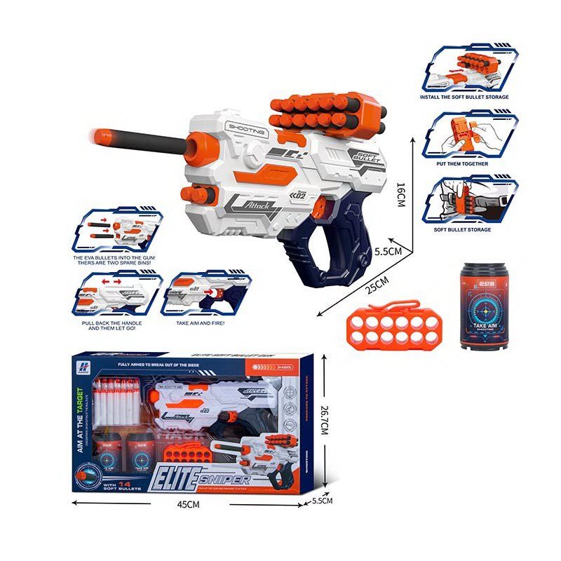 Хлопчаки – це справжні захисники, які змалку готові боротися зі злом і несправедливістю. Тому серед їхніх ігор переважають всілякі “стрілялки” та “війнушки”, для яких потрібна відповідна зброя та аксесуари. Ігровий бластер, арт. 9002B-1 стане чудовим доповненням дитячих ігор. З таким комплектом кожен відчує себе супергероєм. У набір входять бластер, 14 м’яких патронів, обойма та 2 банки-мішені для відпрацювання влучності стрільби. Зброя зроблена в білому кольорі з яскравими вставками, має оригінальний дизайн, дуже легка та зручна для дитячих рук. У пістолета ергономічна рукоять і м’який спуск, тому стрілець завжди потрапить у ціль. М’які кулі абсолютно безпечні навіть при пострілах зблизька.